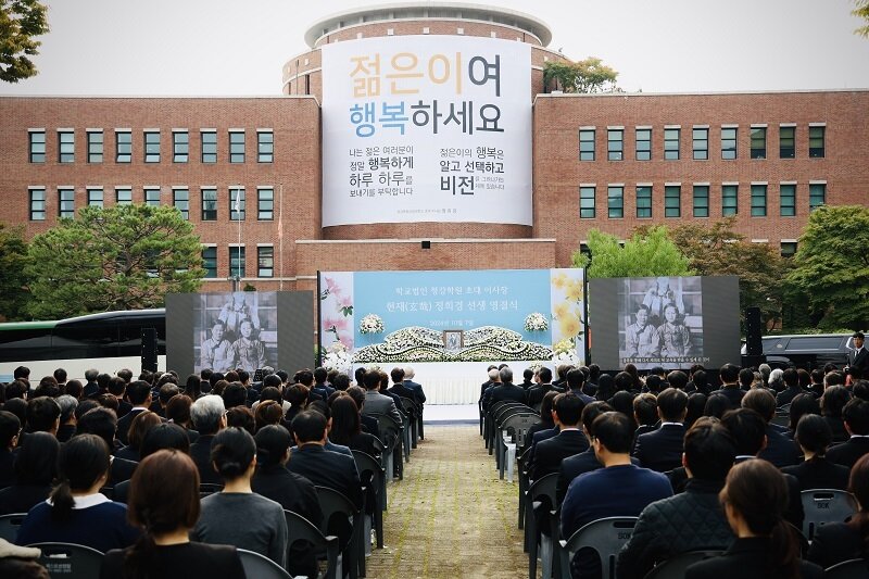 (서울=뉴스1) 장도민 기자 = 정희경 학교법인 청강학원 초대 이사장이 5일 오전 향년 92세의 나이에 지병으로 별세했다. 청강문화산업대학교는 초대 정희경 이사장을 기리기 위해 지난 7일 오전 9시 30분 교내 청현광장에서 영결식을 진행했다.